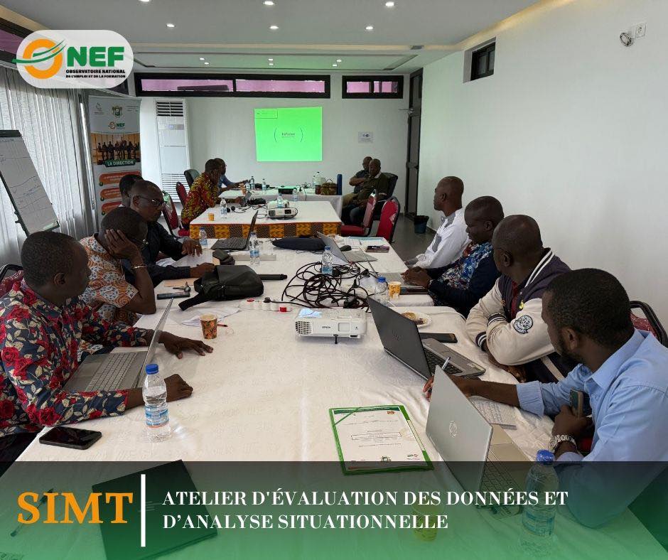 Dans le cadre de la mise en œuvre du programme de doter la Côte d’Ivoire d’un Système d’Information sur le Marché du Travail (SIMT) fonctionnel, 𝐥’𝐎𝐛𝐬𝐞𝐫𝐯𝐚𝐭𝐨𝐢𝐫𝐞 𝐍𝐚𝐭𝐢𝐨𝐧𝐚𝐥 𝐝𝐞 𝐥’𝐄𝐦𝐩𝐥𝐨𝐢 𝐞𝐭 𝐝𝐞 𝐥𝐚 𝐅𝐨𝐫𝐦𝐚𝐭𝐢𝐨𝐧 (𝐎𝐍𝐄𝐅), avec le soutien financier de la 𝐁𝐚𝐧𝐪𝐮𝐞 𝐦𝐨𝐧𝐝𝐢𝐚𝐥𝐞 à travers le 𝐏𝐄𝐉𝐄𝐃𝐄𝐂 𝟑, a organisé, du 𝟎𝟖 𝐚𝐮 𝟏𝟕 𝐬𝐞𝐩𝐭𝐞𝐦𝐛𝐫𝐞 𝟐𝟎𝟐𝟓, 𝐚̀ 𝐆𝐫𝐚𝐧𝐝-𝐁𝐚𝐬𝐬𝐚𝐦, 𝐮𝐧 𝐚𝐭𝐞𝐥𝐢𝐞𝐫 𝐝’𝐞́𝐯𝐚𝐥𝐮𝐚𝐭𝐢𝐨𝐧 𝐝𝐞𝐬 𝐝𝐨𝐧𝐧𝐞́𝐞𝐬 𝐞𝐭 𝐝’𝐚𝐧𝐚𝐥𝐲𝐬𝐞 𝐬𝐢𝐭𝐮𝐚𝐭𝐢𝐨𝐧𝐧𝐞𝐥𝐥𝐞.
